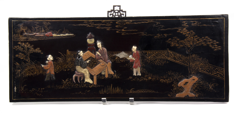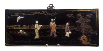A Pair of Chinese Black Lacquer Panels with Inset Hardstone Figures