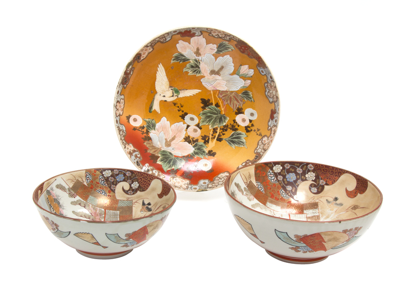 comprising two graduated bowls with figural decoration and a low bowl with birds and floral decoration.