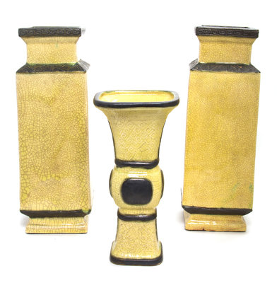 comprising a pair of squared form vases and a gu form vase, each with crackle finish.