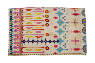 having stylized geometric and floral motifs in bright colors on ivoryground.
