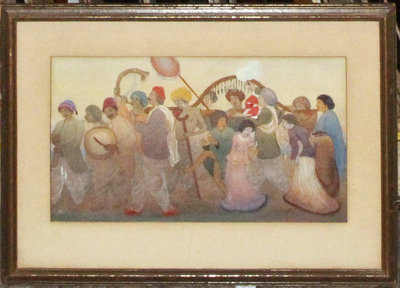depicting figures in a procession with musical instruments, signed Godbole B.G. and dated '29 to the lower right, framed.