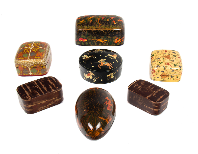 consisting of five Indian laquer boxes from Kashmir, and two of tree bark.