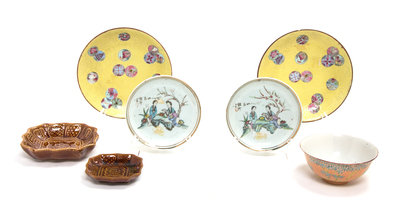 consisting of a tea bowl, a plate with figural decoration, two plates with yellow ground, and two small brown glazed dishes.