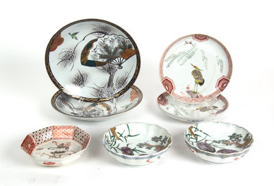 consisting of an octagonal bowl, two bowls with cranes, two bowls with phoenix birds, and two with flowers and birds.