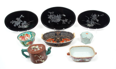 consisting of two porcelain bowls, a teapot, a covered porcelain box, a plique-a-jour style bowl and three silver inlaid ebonized trays.