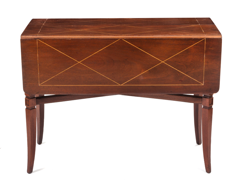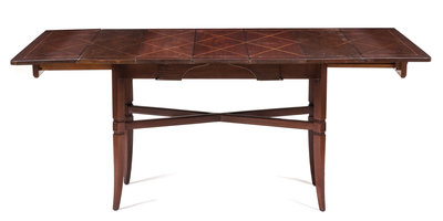 design copyright 1934, with a rectangular top with fruitwood inlay in a geometric diamond pattern, with three leaves and draw-leaf action converting to a drop-leaf table, on square tapering legs, bearing Charak label to underside of top.
