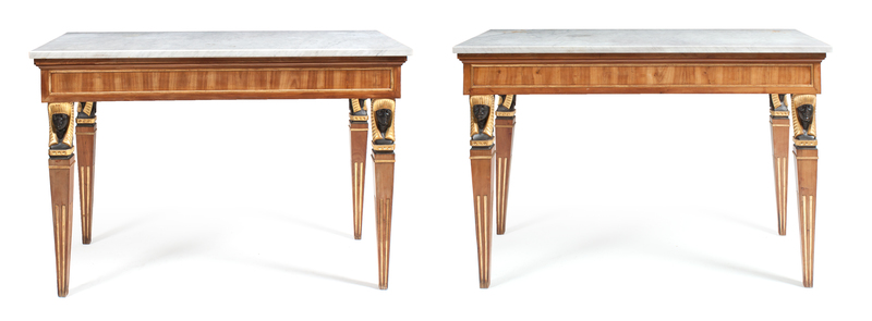 each having a later rectangular marble top and a plain frieze, raised on square fluted tapering legs headed by Egyptian revival busts, both tables with crowned N marks and retaining Italian paper retailer labels.