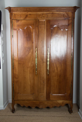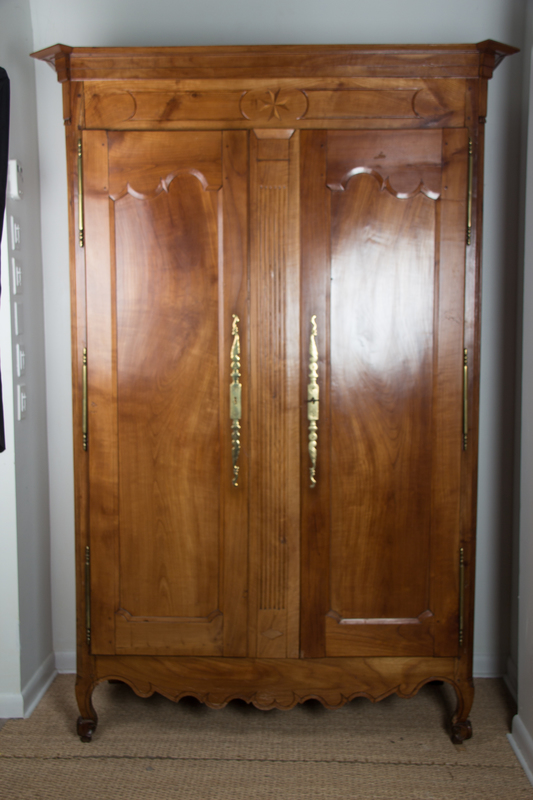 with shaped molded cornice with two panel doors opening to interior with shelves.