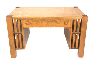 having one central frieze drawer, each side having two shelves on straight square legs.
