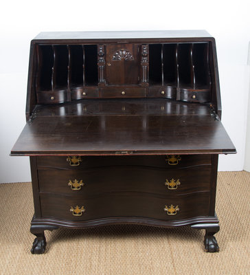 having a rectangular top over slant front opening to multidrawer and cubby hole interior, over four drawers; resting on claw and ball feet.