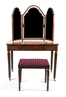 rectangular leather inset top over two apron drawers resting on fluted tapering legs ending in brass capped castors with a tri-fold mirror and matching bench.