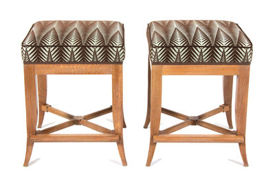 of square form with slightly scrolled legs joined by an X-form stretcher, having stylized brown/cream foliate upholstery