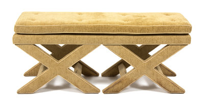 of rectangular form with loose seat cushion, upholstered in wheat colored loose woven fabric.