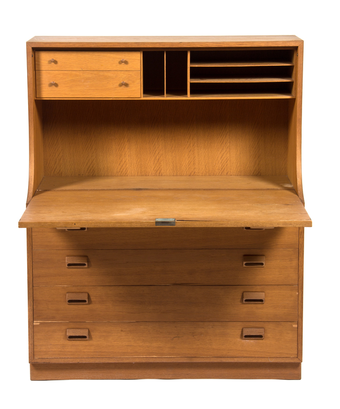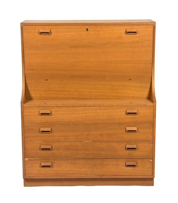 having a rectangular top over the fall front opening to an interior with two drawers and cubby holed raised section; lower section having four drawers.