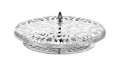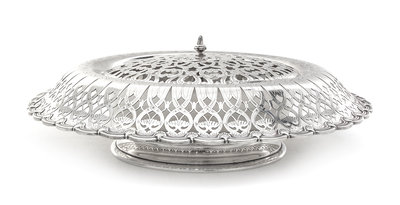 circular, with turned-over border pierced and engraved with scrolling strapwork and stylized foliage, the scalloped rim with shells at intervals, with removable silver-plate flower grid engraved to match