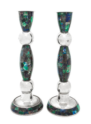 A Pair of Mexican Hardstone Mounted Silver-Plate Candlesticks
