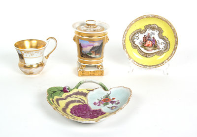 consisting of a KPM porcleain cup, a leaf form dish, a small circular dish with yellow border, and a small cache pot with painted alpine scene.