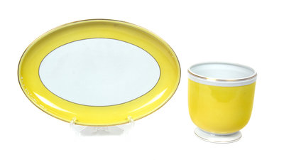 each with yellow and gilt banding on a white ground, consisting of a Portuguese jardiniere retailed by Tiffany & Co., and an oval platter by Furstenberg.