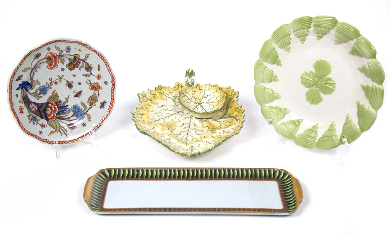 consisting of a Portuguese leaf form dish, a Mottahedah shell decorated dish, a French porcelain rectangular serving dish, and a circular plate with floral decoration.