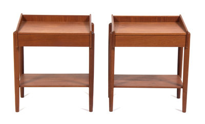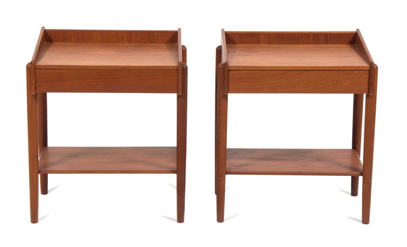 having a three-quarter gallery top over one drawer, tapered round legs connected by strecher shelf.