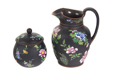 consisting of a small ewer and a covered circular box, having polychrome enamel floral decoration.