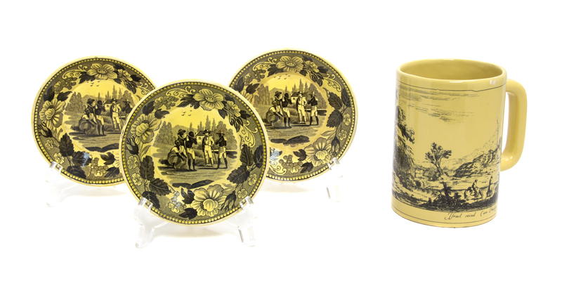having black transfer decoration on yellow ground, consisting of three small bowls with plantation scenes, and a handled mug with figures in landscape decoration.