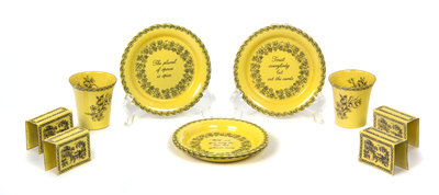 consisting of four small dishes, four matchbox holders and two small cups, having black transfer decoration.
