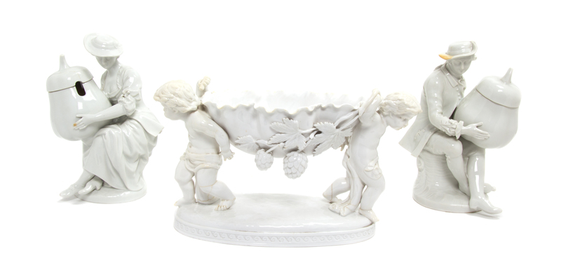 consisting of a apir of KPM seated figures each holding a pear-form condiment pot, and a Spoke sauce boat supported by two fully sculpted putto on oval base.