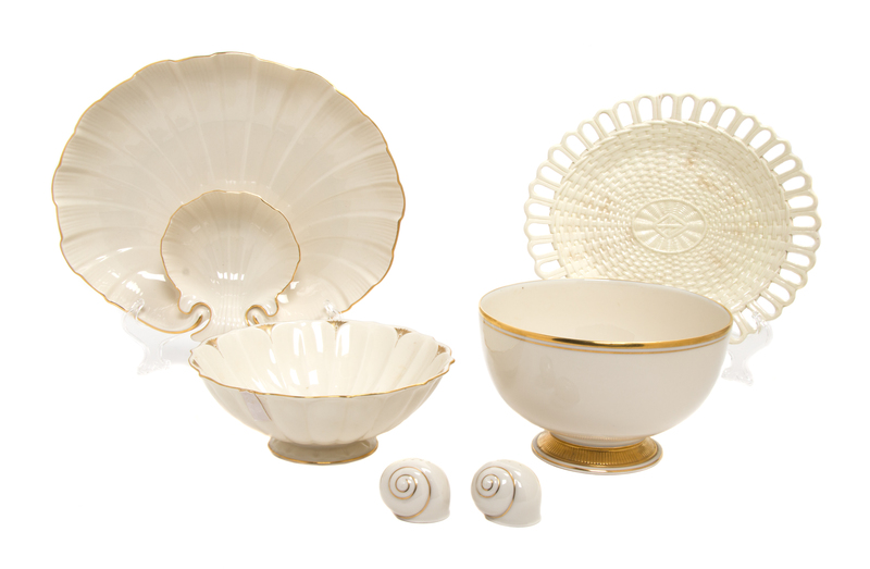 consisting of a basket weave plate, two Lenox bowls and a shell-formserving dish.