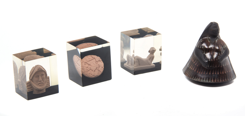 a partially glazed black pottery figure of a woman signed "Manuel" on base, and three plexiglass cubes with embeded Mayan pottery fragments.