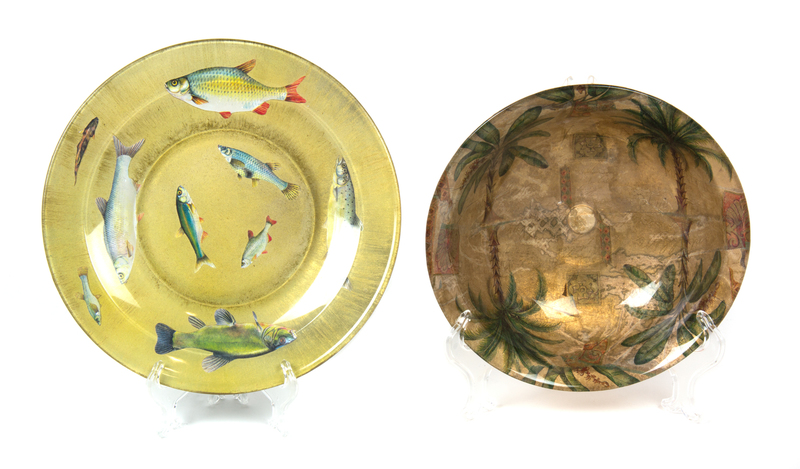 consisting of a bowl decorated with palm trees, and a charger with fish.