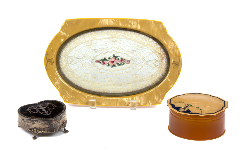 consisting of an English silver footed heart shaped box with faux tortoise shell top with silver inlay, marked Birmingham, 19; together with an Art Deco celluloid covered powder box and perfume tray with lace inset.