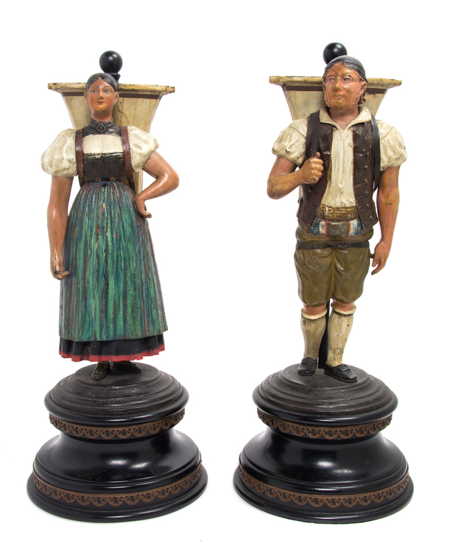 depicting a man and woman, each carrying a box on their back; resting on socle bases.