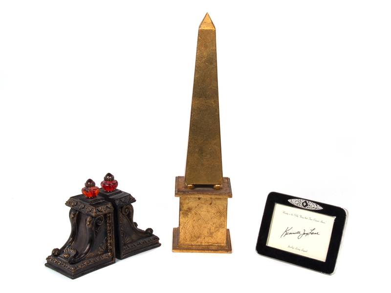 consisting of a gilt decorated obelisk, a pair of book ends, a silvered metal and enamel picture frame and a carved wooden box.