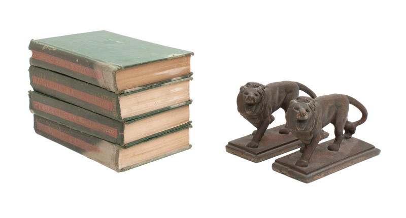 in the form of lions raised on a black marble base, together with four bound volumes of Shakespeare plays.