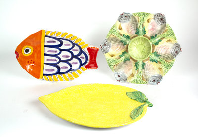 comprised of a lemon form platter, and two serving dishes with fish decoration.