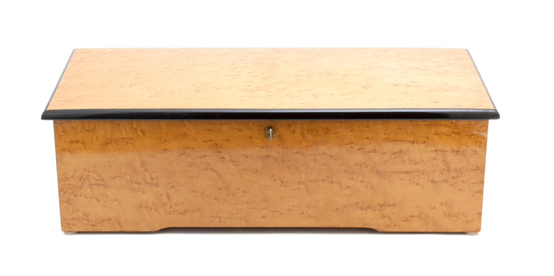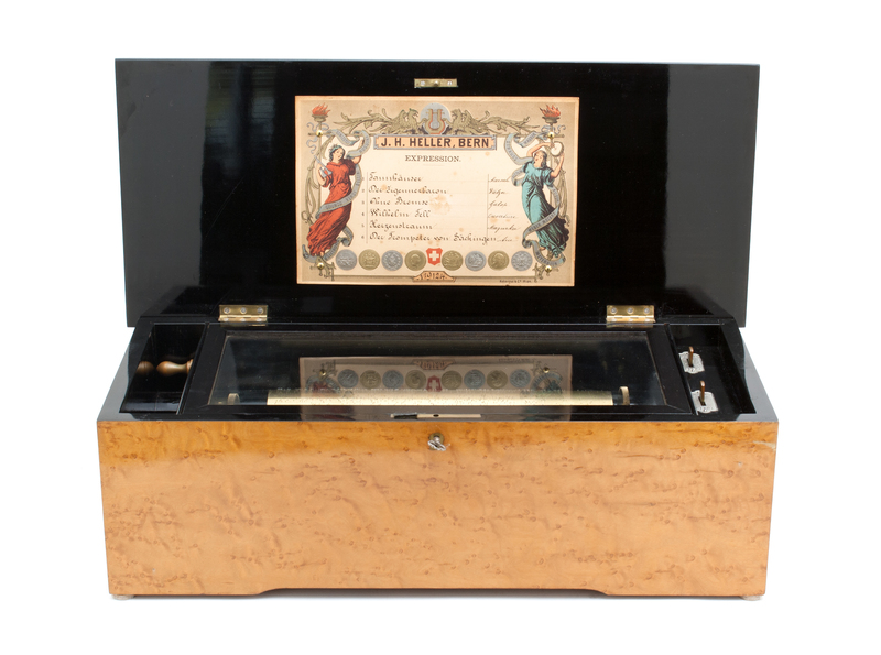 having a bird's eye maple case with enhanced original finish and ebonized highlights and interior, glass paneled interior dust cover with internal crank ratchet winding mechanism on the left side of the case and start/stop and repeat/change switches on the right side, will play 6 tunes on an brass cylinder and original tune card under the lid signed J.H. Heller and numbered 9124.