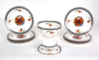 having thickly painted deer and flying cranes within a black geometric border, comprising ten plates, a deep bowl and a two handled bouillon cup with undertray.