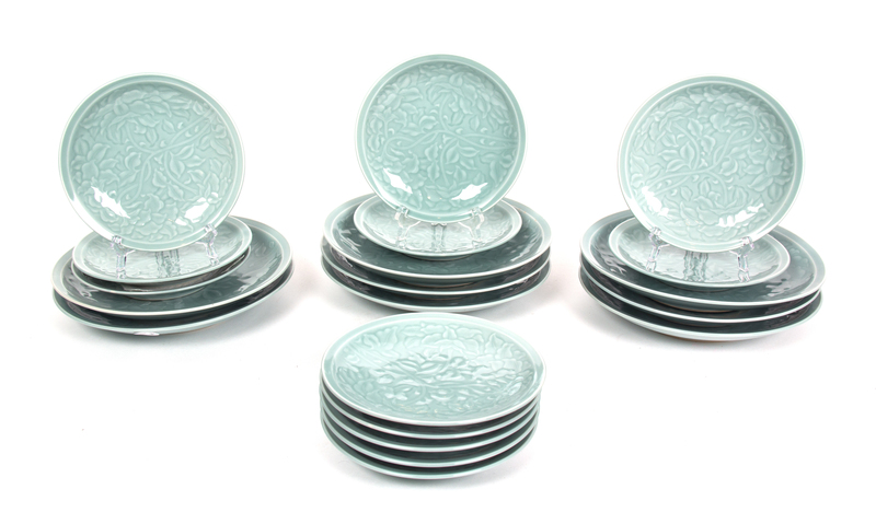 with a slightly raised floral and foliate design; comprised of 8 dinner plates and 12 side plates.