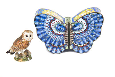 one of owl form with inset stones, the other of butterfly form with hinged lids.