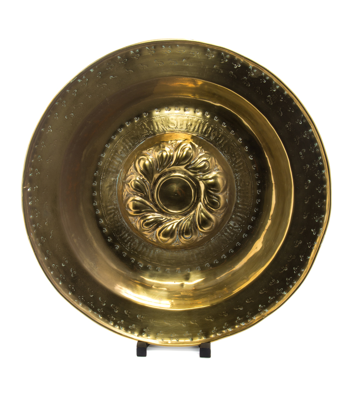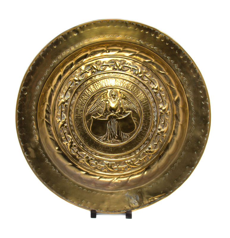 each having bands of repousse and etched decoration, one with central winged figure holding a shield.