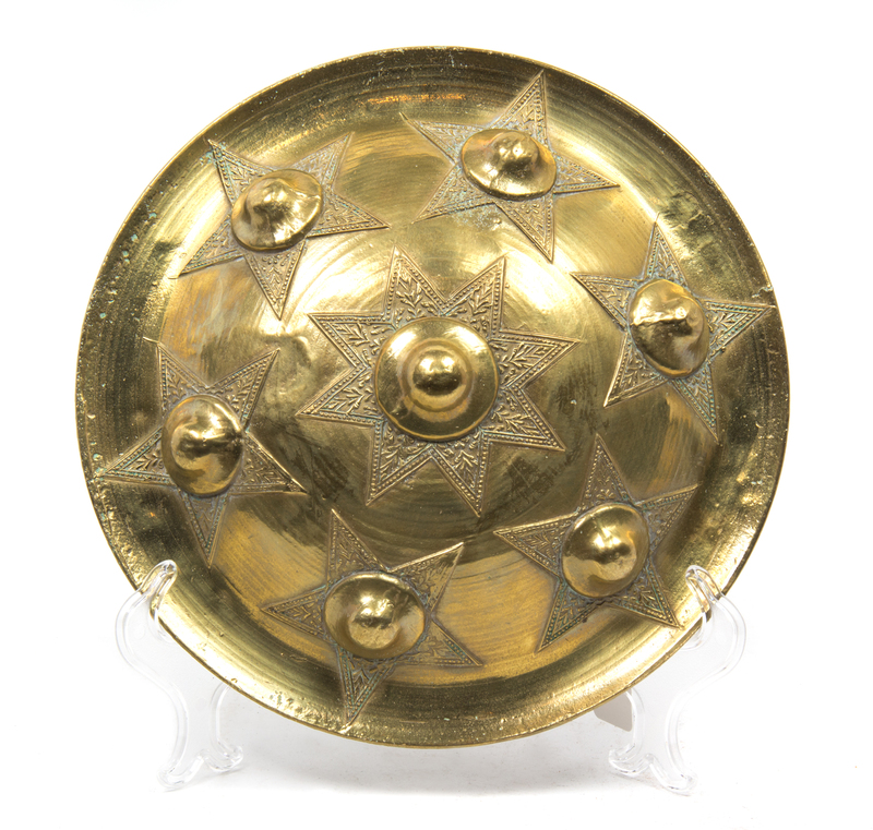 of convex form having raised whirl and star decoration, with rope handle on reverse.