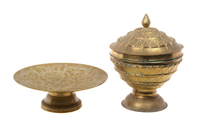 consisting of a covered bowl with knop finial, etched and embossed geometric decoration, and a footed tazza with floral and foliate etched decoration.