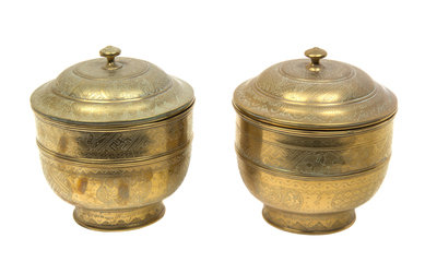 A Pair of Southeast Asian Brass Covered Spice Boxes