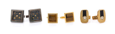 consisting of a pair of 18 karat yellow gold, onyx and diamond cufflinks, a pair of silver and gold accented cufflinks (AERIE), and a pair of gold tone and tiger's eye cufflinks.