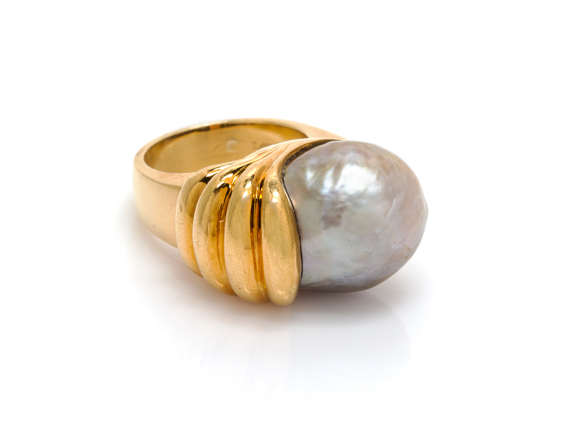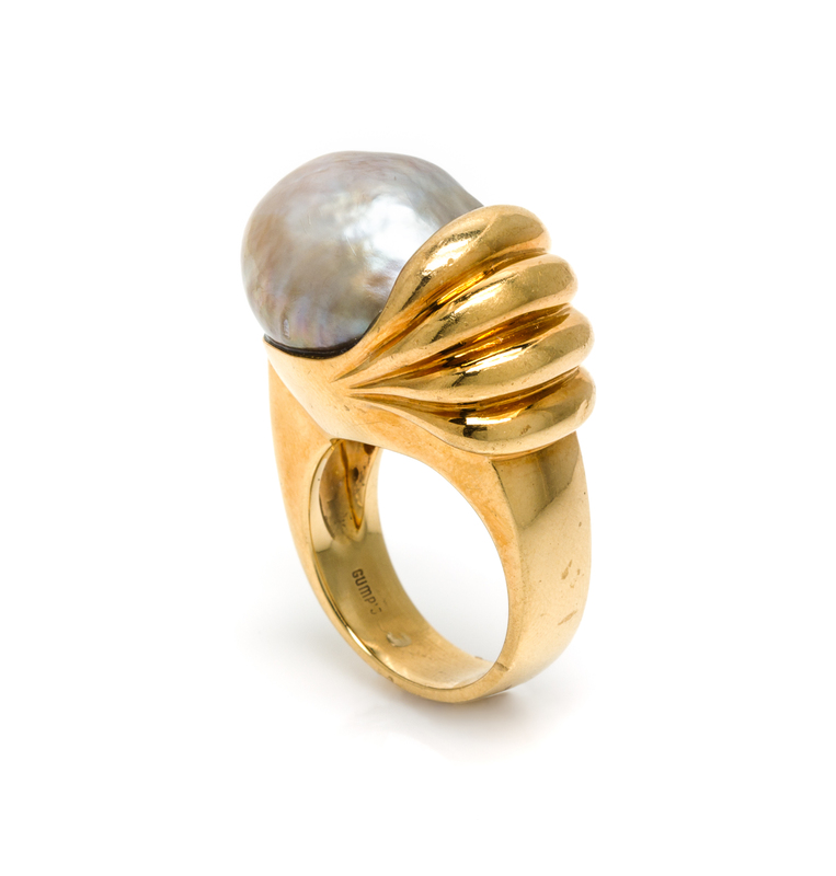 containing one baroque pearl measuring approximately 16.31 x 15.65 mm within the fluted asymmetric setting.Stamp: 18K Gumps.