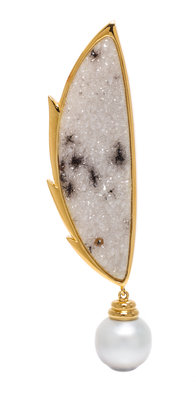 An 18 Karat Yellow Gold, Druzy Quartz and Cultured Pearl Brooch,