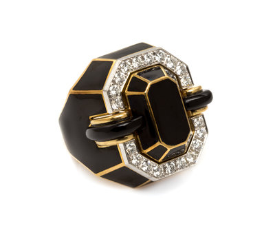 in a geometric design composed of black enamel sections within gold boundaries accented with 20 round brilliant cut diamonds weighing approximately 0.70 carat total.