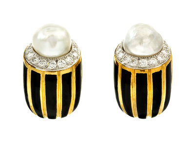 A Pair of 18 Karat Yellow Gold, Platinum, Diamond, Cultured Pearl and Enamel Earclips, David Webb,