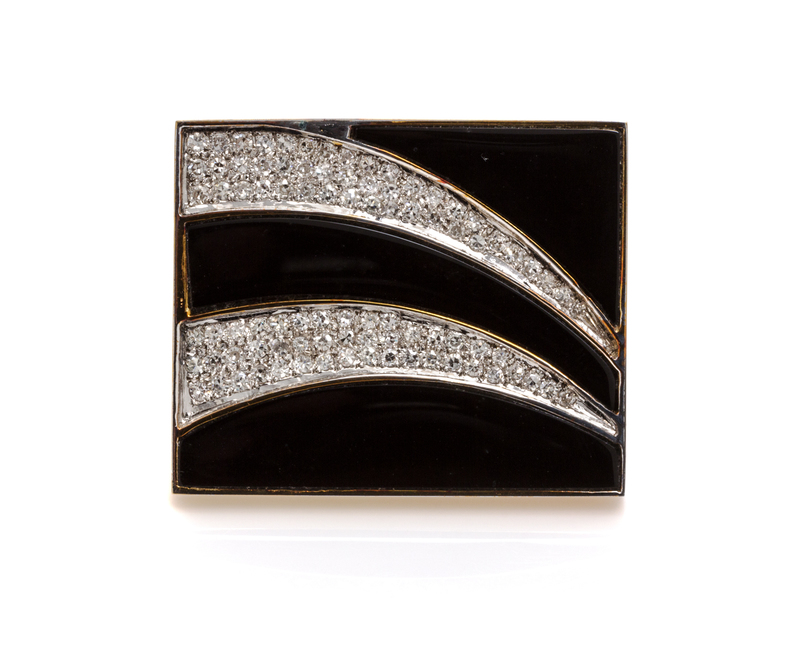 A 14 Karat Yellow Gold, Onyx and Diamond Brooch,